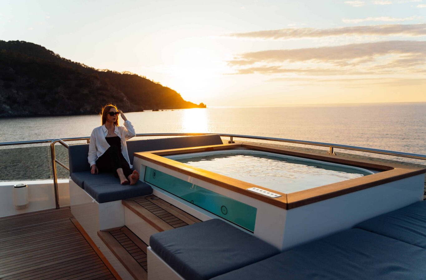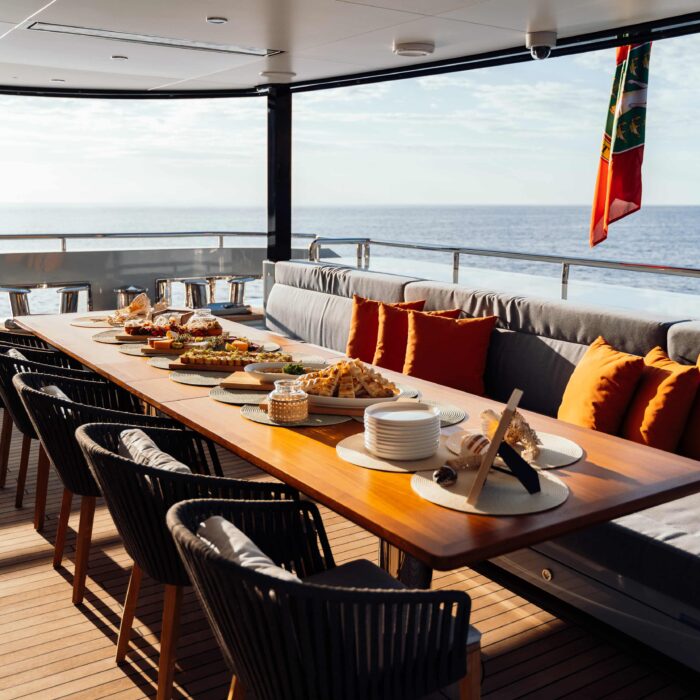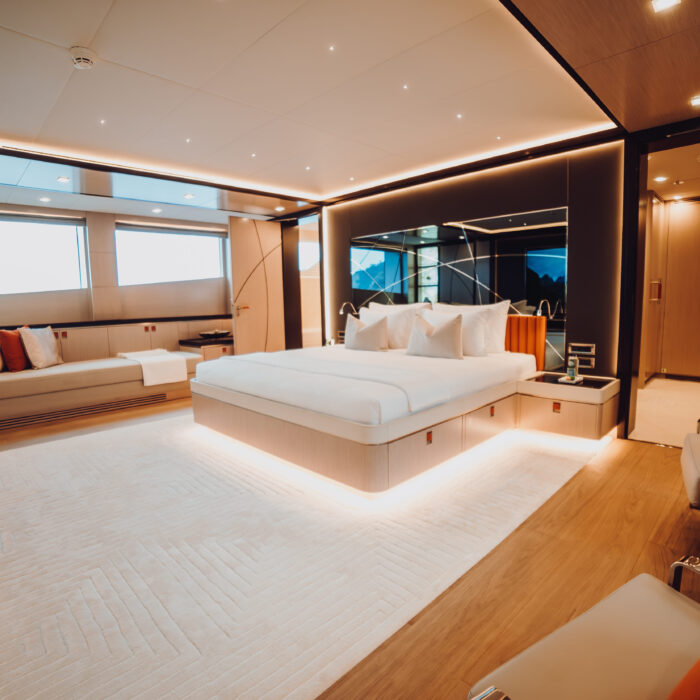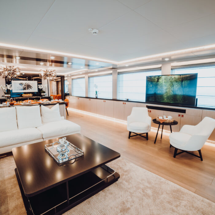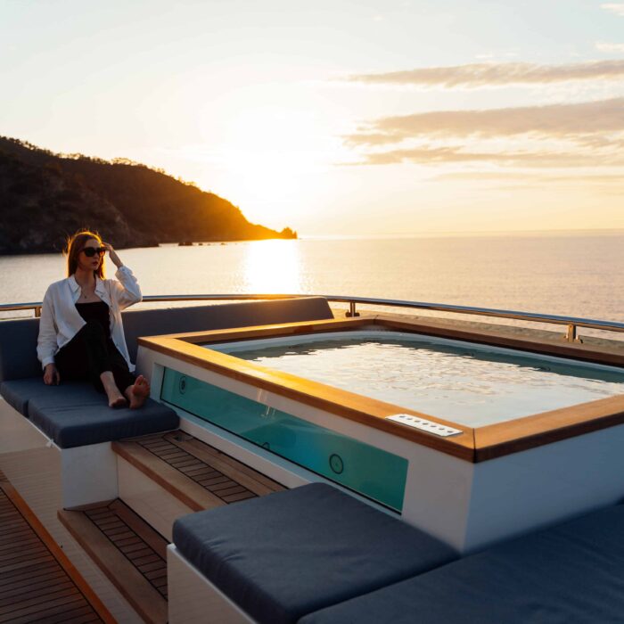 - 40 square-meter beach club with large opening sea terrace door and access to the stern platform. The beach club has a sauna and Hamman for guest use as well as relaxed informal seating