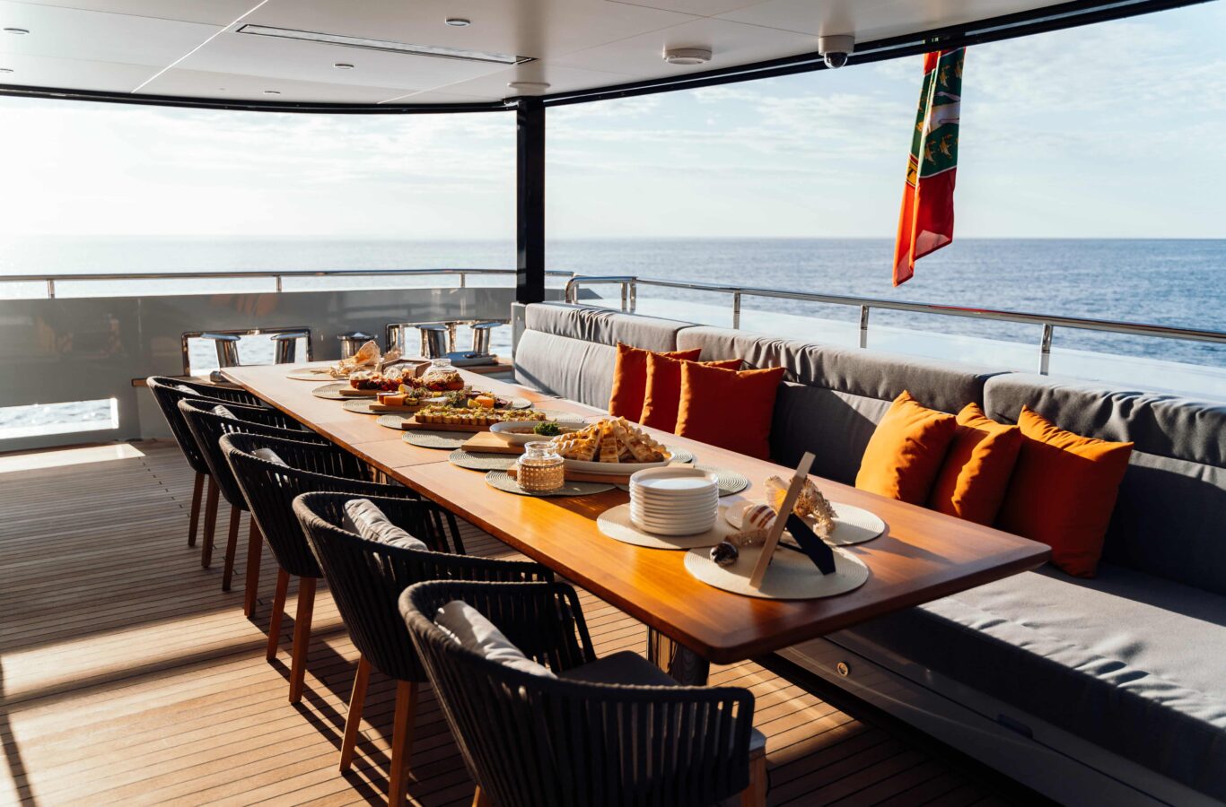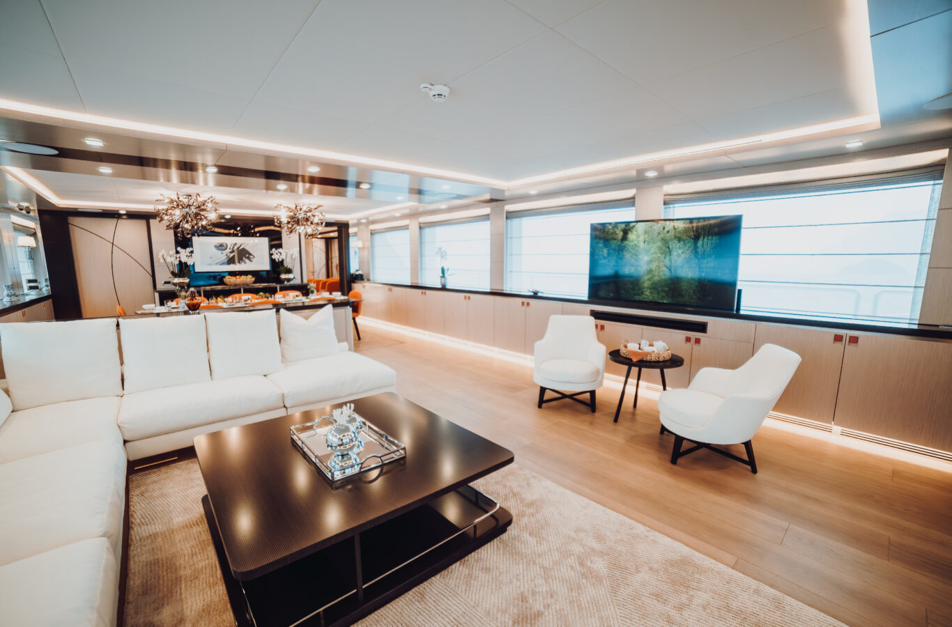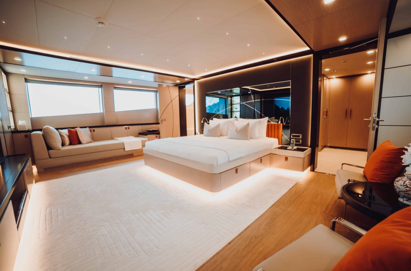- 40 square-meter beach club with large opening sea terrace door and access to the stern platform. The beach club has a sauna and Hamman for guest use as well as relaxed informal seating