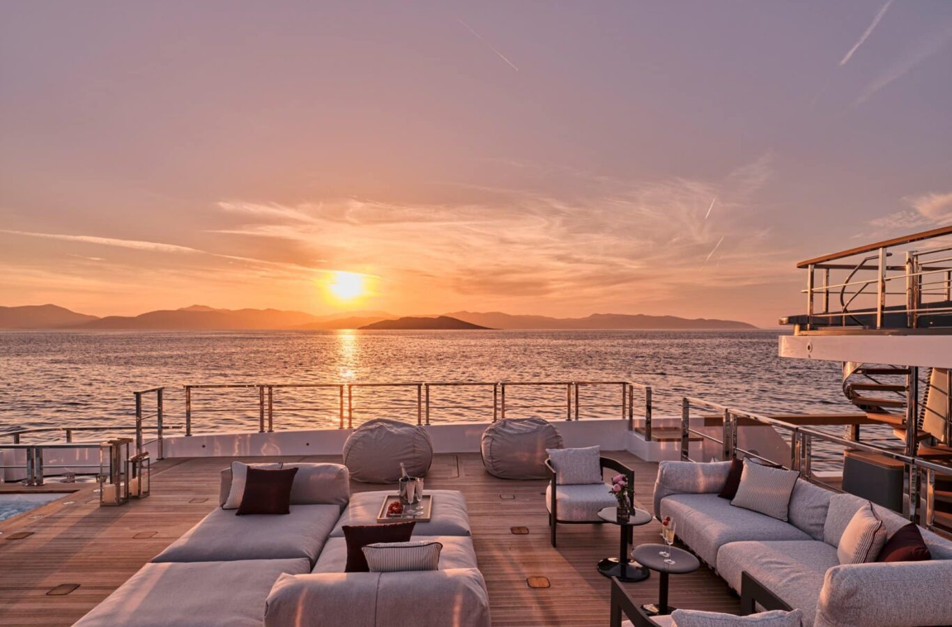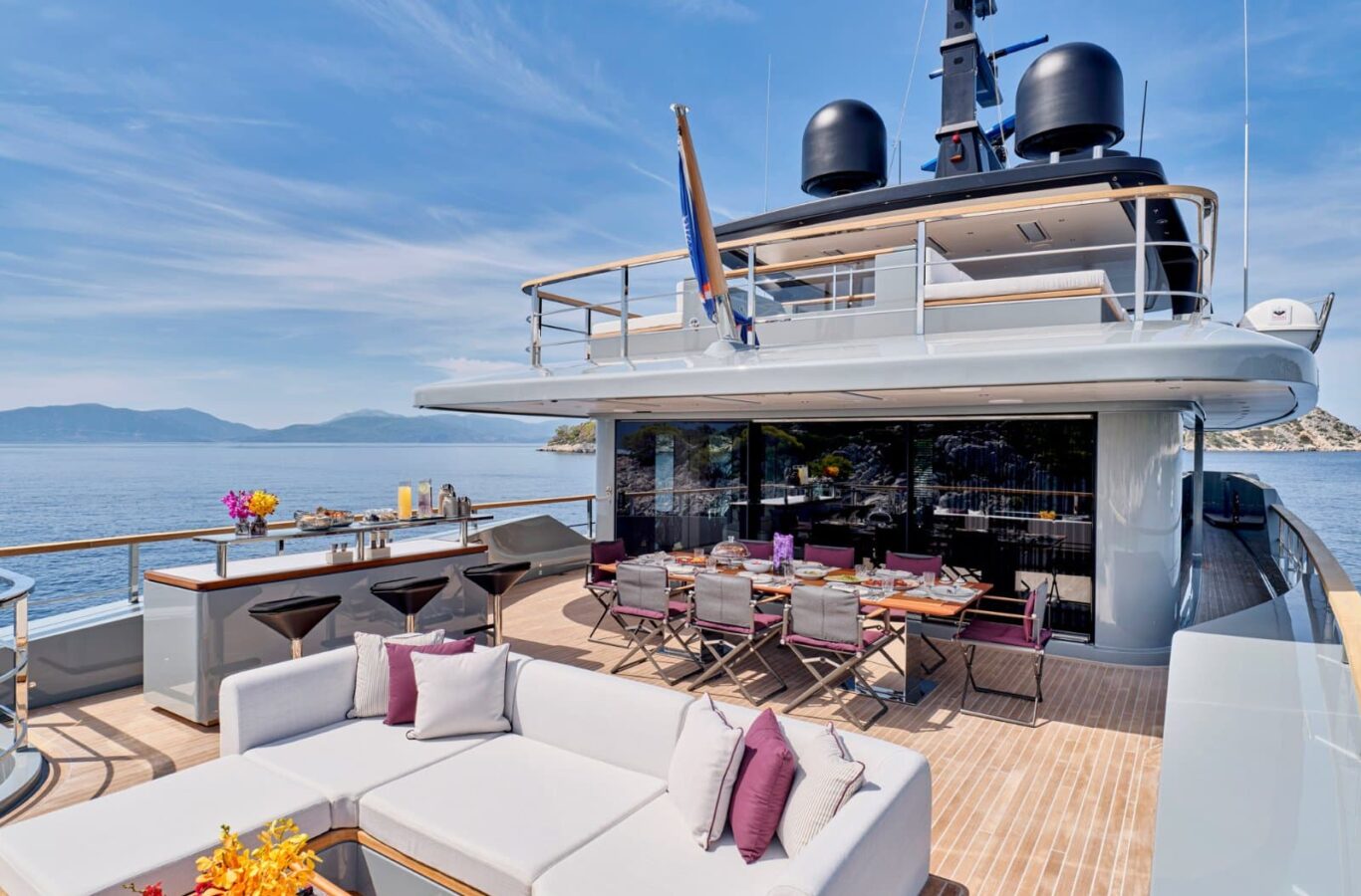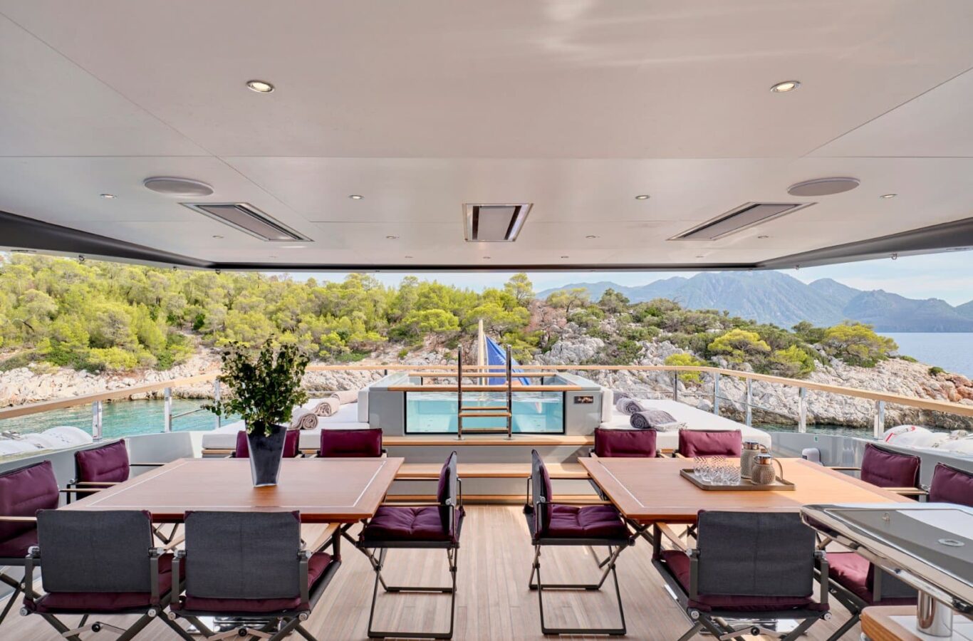 - Vast quarter-deck with infinity pool, and spacious sundeck, featuring a Jacuzzi, dining area and observation lounge