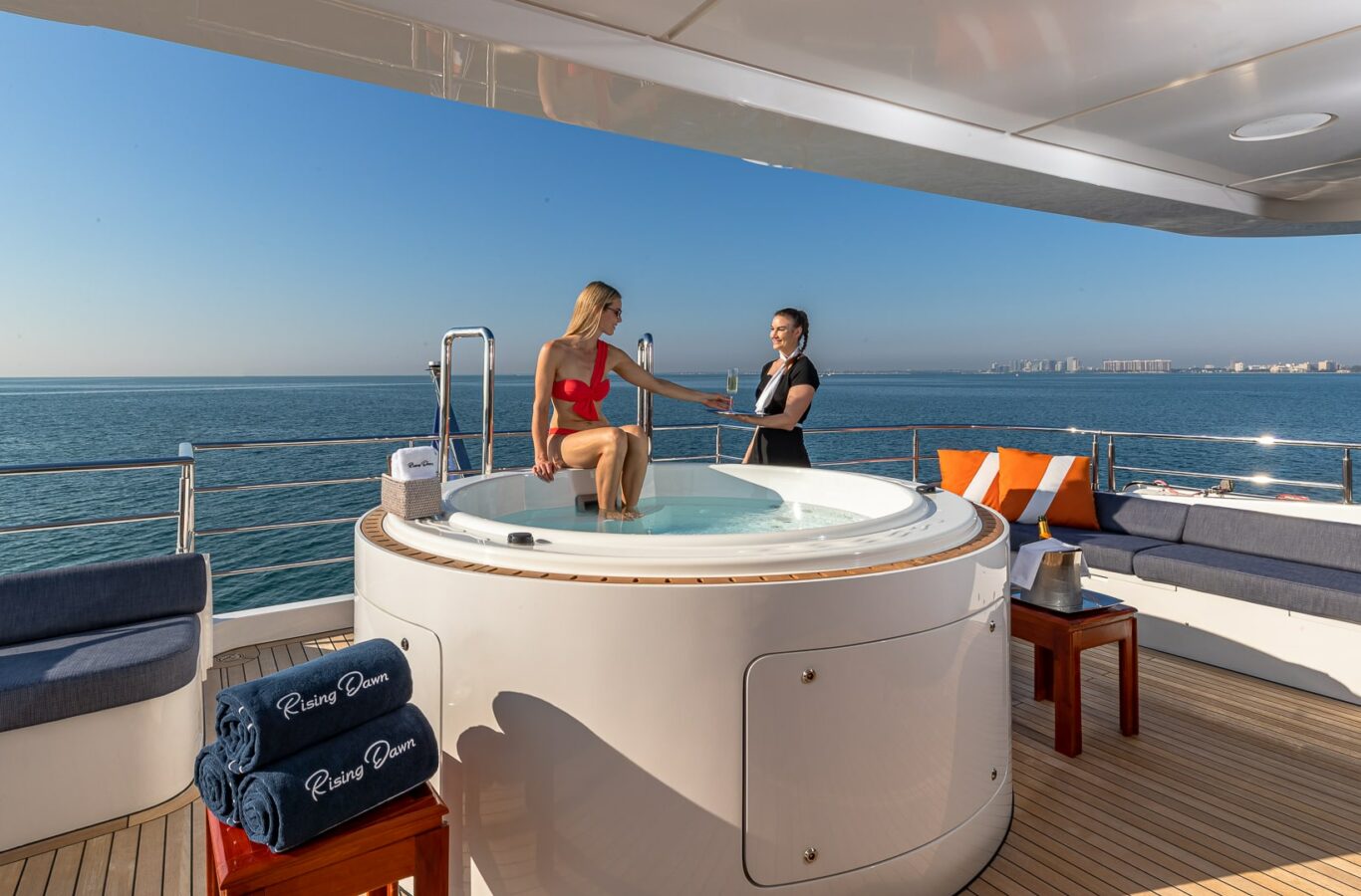 Best Interior Design, Best in Show, the recent awards say it all. What a fabulous yacht to welcome onto the charter market. The use of space is exceptional for a 43 metre, with multiple lounging and dining areas, two fold-out balconies on the main deck, large beach club and six luxurious staterooms for up to 12 guests. Throw in a vast array of water sports for serious fun-lovers and a top crew it’s easy to see why we rate RISING DAWN very highly.